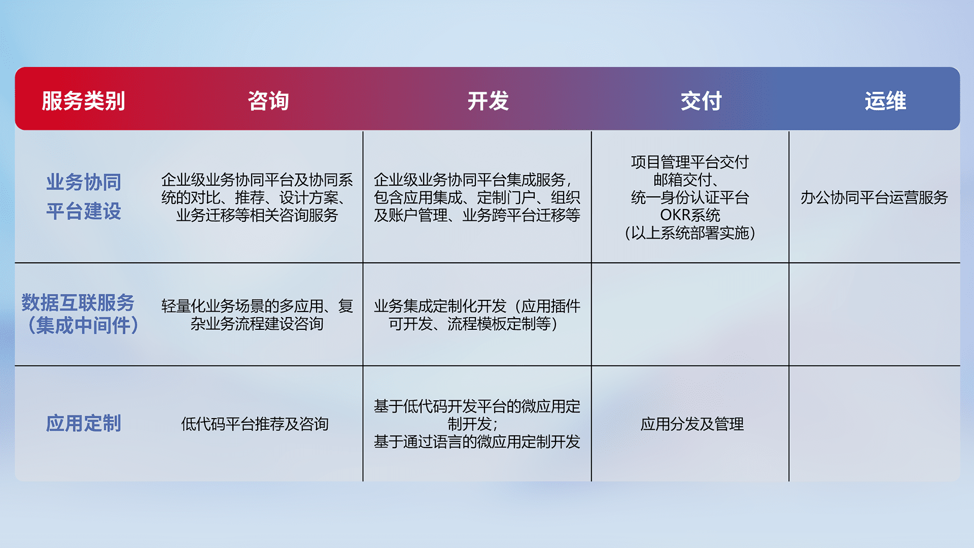 针对钉钉、、、企微、、、、IDaas等平台级产品提供产品的规划、、、方案、、、交付、、定制化开发等服务,,实现如统一协同办公、、、智能客户服务、、、混合会议管理、、、智能数据查询、、、、等业务场景,,实现数字化转型。。。