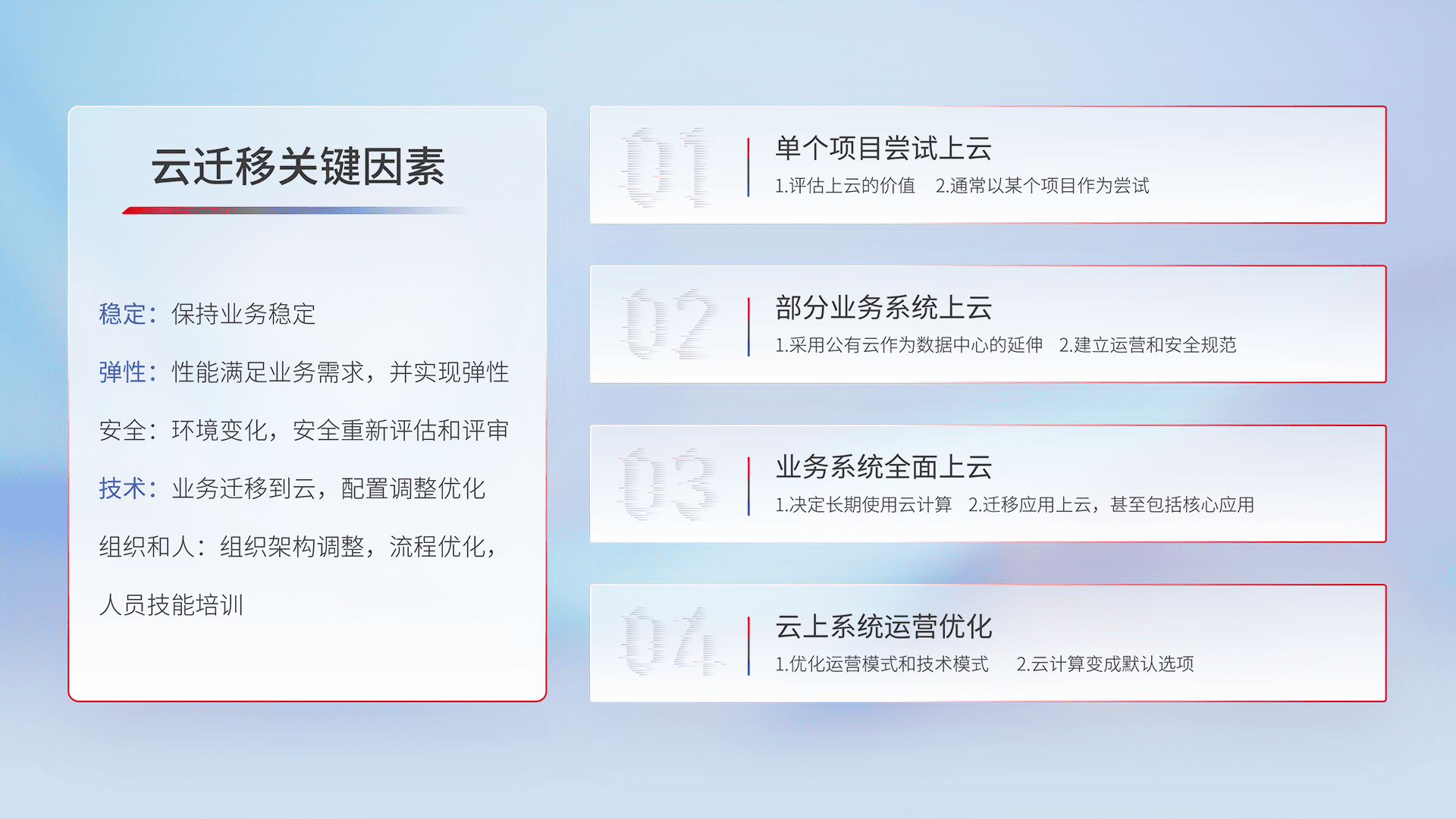 结合实际业务,,,,从规划设计、、、、云平台选型、、、云原生改造、、、、数据迁移、、、、集成交付,,,迁移全过程为客户识别最佳上云路径,,,做好风险识别管理,,设计网络架构、、、身份权限、、安全审计合规、、操作审计、、、、日志审计、、监控告警策略、、、、多站点容灾设计等,,,,对云上基础设施进行整体规划,,,,提升IT治理水平,,,以满足弹性、、、高可用、、、、高性能的需求。。。