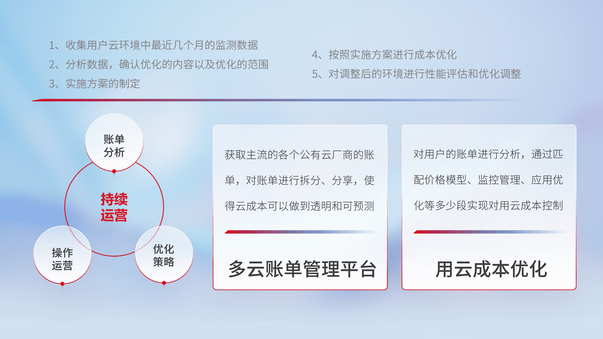 通过多云纳管,,,,以统一的资源数据模型把客户的云资源进行抽象和封装,,,进而实现对多云资源的统一操作,,保障云资源管理的可靠性、、稳定性与可用性。。。量身定制化运维内容,,,,配置、、、开发运维、、、、补丁管理、、、、备份、、监控、、、、认证和访问管理、、审计和日常巡检等,,保障在用云过程中的可靠度,,,稳定度以及高可用率。。。
